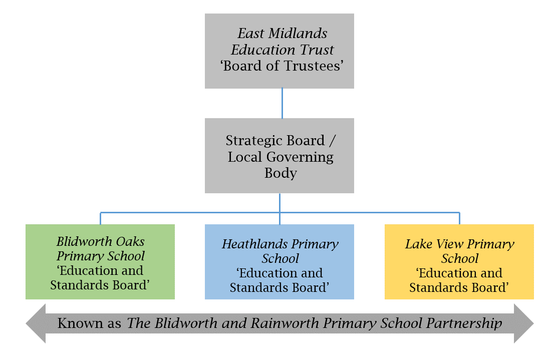 Our local governance arrangements within East Midlands Education Trust comprise of one 'Strategic Board' of governors (the LGB) that oversee Lake View Primary School, Heathlands Primary School and Blidworth Oaks Primary School. Each school has its own 'Education and Standards Board', a sub-committee of governors that report directly to the central 'Strategic Board'.